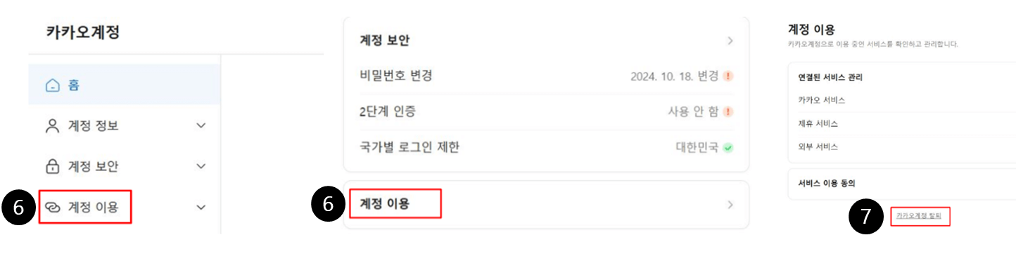 카카오계정 홈페이지(https://accounts.kakao.com) > 6.계정 이용> 7.카카오계정 탈퇴 클릭