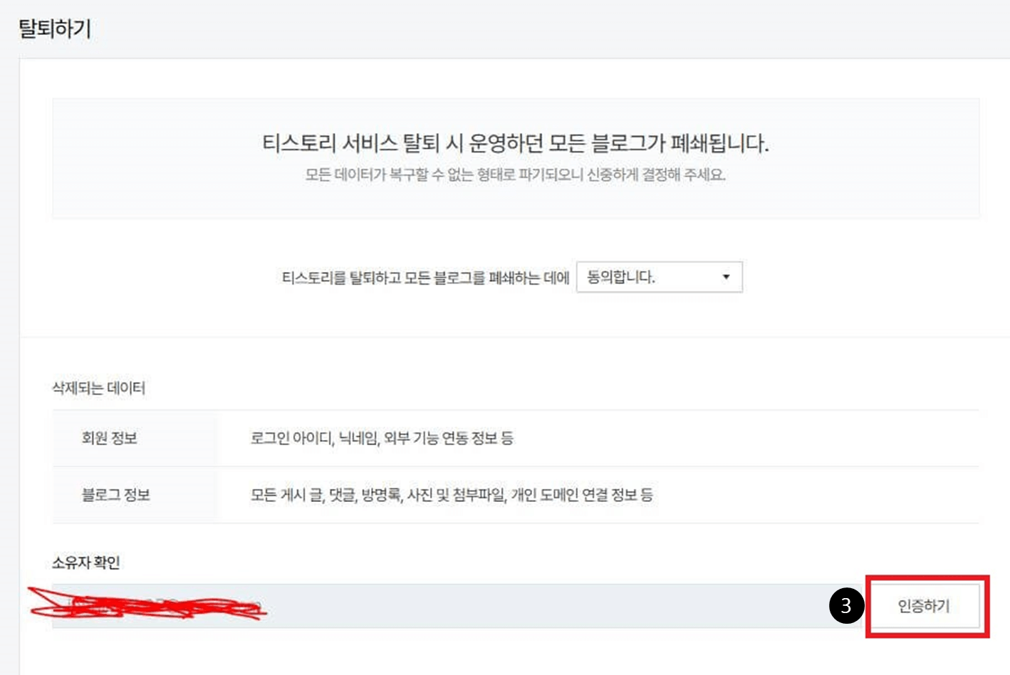 1.계정관리 > 2. 티스토리에서 탈퇴하기 > 3. 인증하기