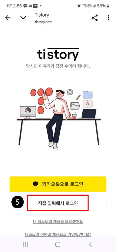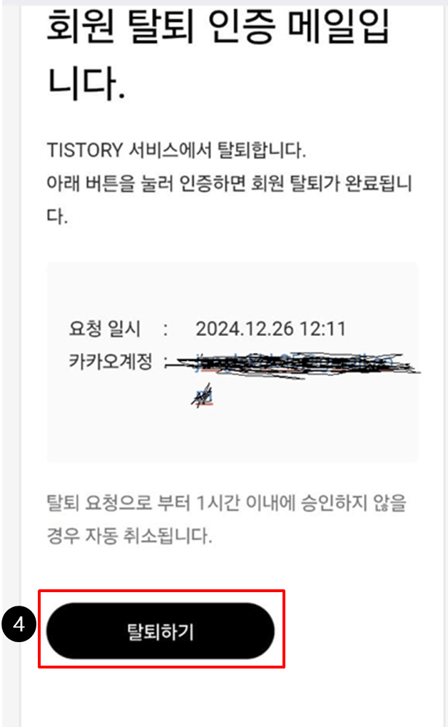4.회원 탈퇴 인증 메일에서 탈퇴하기 클릭 > 5.직접 입력해서 로그인 클릭 > 계정정보 입력 후 로그인 > 티스토리 서비스 탈퇴 완료